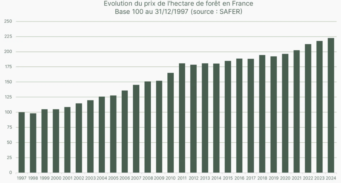 Le prix du bois et du foncier forestier est porté par des tendances de long terme (logement, énergie, construction bois, transition écologique). Résultat : les forêts voient leur valeur progresser doucement, même lors des crises économiques ou financières.