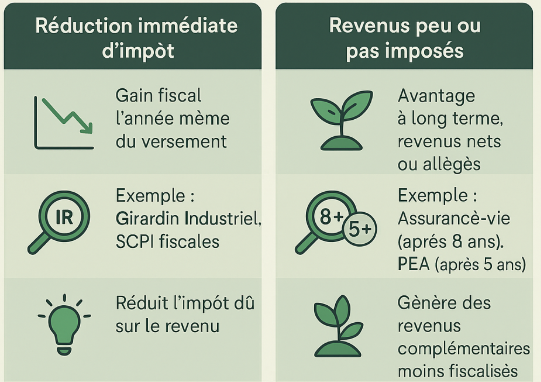 Une réduction d’impôt vient soustraire une somme de vos impôts (ex. : 30 % du montant investi), mais ne garantit pas un revenu futur.